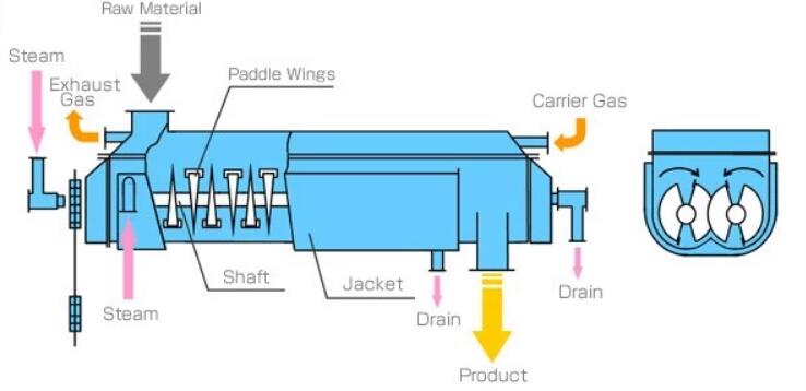 CHPD Contnuous Hollow Paddle dryer is a dryer that allows materals ( organic, inorganic particles or powder material ) to be drectly contacted with a rotating hollow wedge-type heating part for heat transfer. It does not require air as a heating medium, the air used is only a carrier to take vapor out.